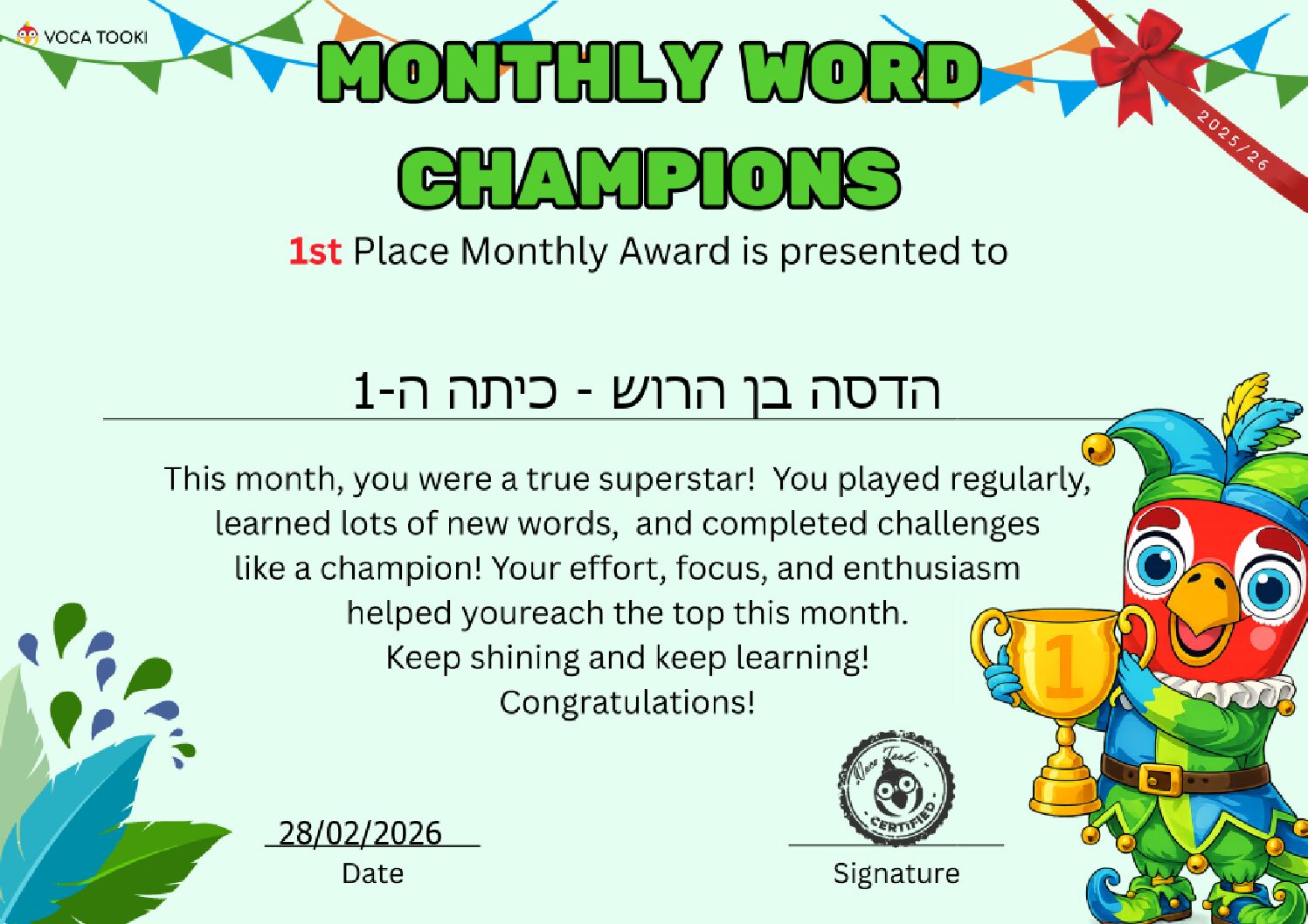 כמו כן- ממתינות לכן משימות באתר גלים (לכיתות ז- ח) ובאתר vooca tooki (כיתות ה-ו) . בהצלחה!!